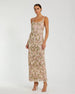 Elegant fully beaded floral midi cocktail dress with a scoop back and back slit.