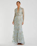 Long sleeve v-neck lace gown with decorative metallic gold beading applique and embroidered detail throughout. Natural waist is accent by a hand-beaded belt.