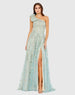 Serve up head-to-toe beauty in this incredible gown. Made from shimmery, botanical-embroidered tulle, the feminine gown is detailed with rhinestone trim at the waist and topped with a feminine full bow at the single shoulder. It’s glamorous, romantic—and with a high leg slit—flirty, too.