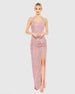 Crafted with a sequined mesh overlay, this gown exudes elegance. Its square halter neckline and low side knot detail above the thigh-high front slit combine to create a show-stopping look. The open back and concealed zipper complete this stunning piece.