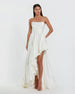 Introducing our Strapless Ruched High Low Gown, a captivating blend of modern style and classic elegance. Crafted from luxurious satin fabric with a fully lined bodice and skirt, this gown features a chic strapless neckline and sleeveless design. With its dramatic asymmetrical high-low hemline, it promises to make a statement at any event.