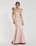 This stunning mermaid gown features a striking yet romantic silhouette, bold ruffle shoulder details, and floral embroidery along the bodice—ideal for an elegant, unforgettable occasion.