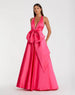 The Pink Deep V Satin Ballgown with Oversized Bow features a sleek halter design, dramatic deep v-neckline, open back, and a bold oversized bow, exuding striking glamour and making it the perfect statement piece for any special occasion.