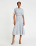 This charming dress is crafted from boucle fabric, offering a textured and sophisticated look. The flattering A-line silhouette, paired with a high neckline and short sleeves, creates a timeless, elegant style. Beaded pearl waist and trim details add a touch of refinement, while the frill detailing adds a playful touch. Perfect for daytime events, brunches, or casual outings, this dress effortlessly combines elegance with modern flair, making it a versatile addition to your wardrobe.