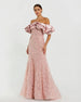 This stunning gown features an off the shoulder neckline and a flattering mermaid silhouette. Made from an intricate embellished fabric, it adds a touch of elegance and sophistication to any formal occasion.