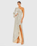 This stunning sequin gown features a one shoulder neckline and a daring side slit.