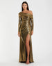 Gold Long Sleeve Off the Shoulder Metallic Gown