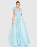 V-neck sleeveless ball gown with ruffled shoulder ruched empire waist and ruffles flowing down the skirt.