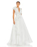 V-neck sleeveless ball gown with ruffled shoulder ruched empire waist and ruffles flowing down the skirt.