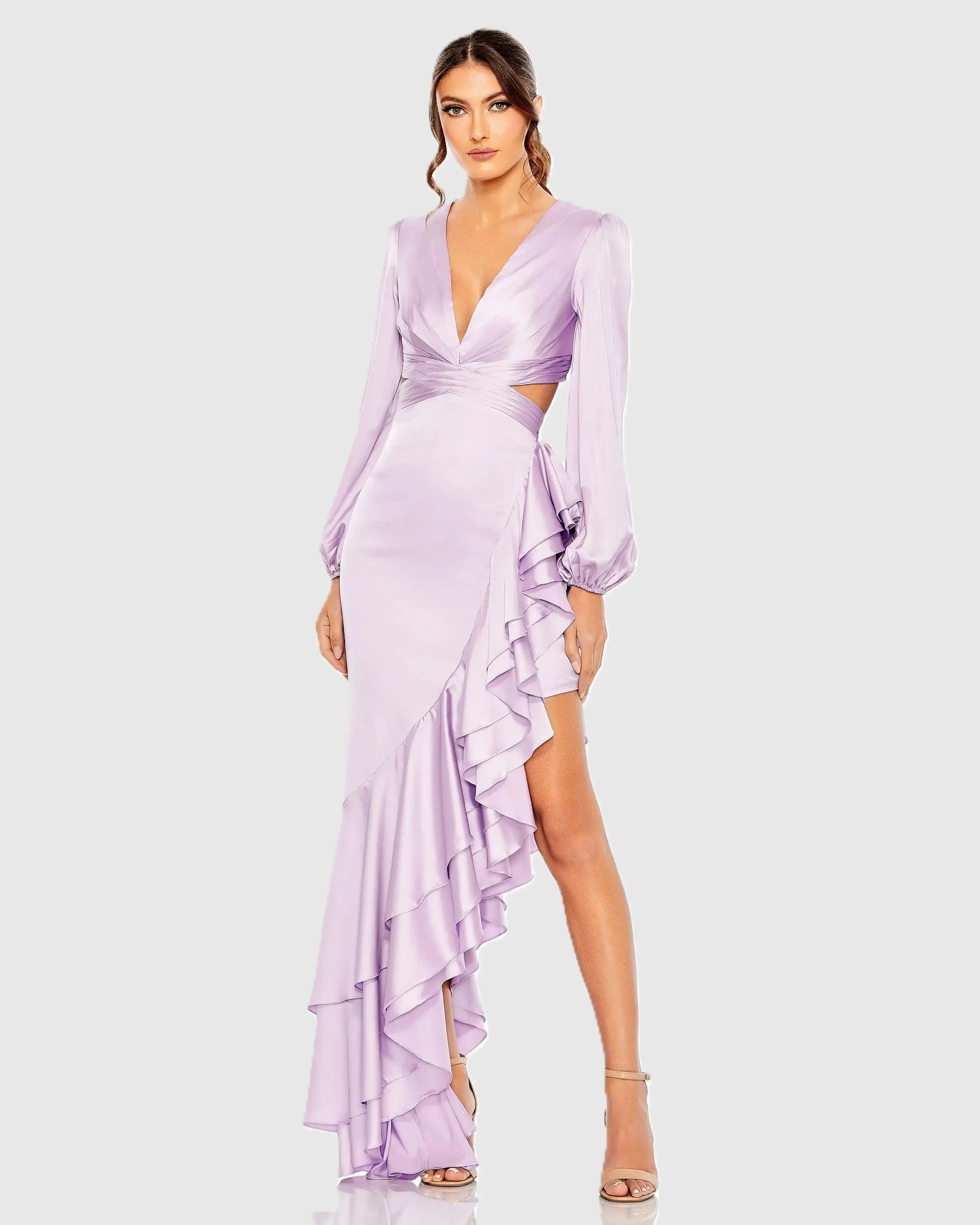 The best design details come together for an eye-catching dress that’s everything you want it to be. Trendy, chic, sexy, and sophisticated, this satin gown is fashioned with a deep V-neckline, puff-shoulder long sleeves, cutouts at the sides, and an asymmetrical, tiered ruffle that highlights your gams.