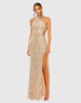 Elevate your style with this all over sequined gown with beaded and embellished neck detailing. Featuring a fully lined bodice, high neckline, and sleeveless design. The elegant mesh bust inset, side cut-outs, and high slit add a touch of sophistication. Complete with a back zipper.