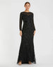 Indulge in timeless elegance with this long sleeve embellished gown, featuring exquisite beading, sheer illusion sleeves, and a flattering hand-beaded belt. Perfect for black-tie galas and evening events, this gown embodies glamour and sophistication.
