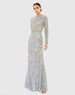 Indulge in timeless elegance with this long sleeve embellished gown, featuring exquisite beading, sheer illusion sleeves, and a flattering hand-beaded belt. Perfect for black-tie galas and evening events, this gown embodies glamour and sophistication.