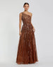 This stunning one-shoulder A-line gown is embellished with cascading diagonal rows of sequins and beads throughout the mesh overlay. The focal point of this gown is the beautiful bead work that lays at the top of the bodice. This gown also features a small sweeping train, and a dainty hand-beaded belt sits at the natural waist.