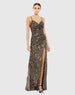 This sexy dress is styled with a faux wrap front, a gathered waist, and a smoldering high slit. The gown features spaghetti straps, a v-neckline, and a plunging open back. Built-in bust pads provide coverage and support.