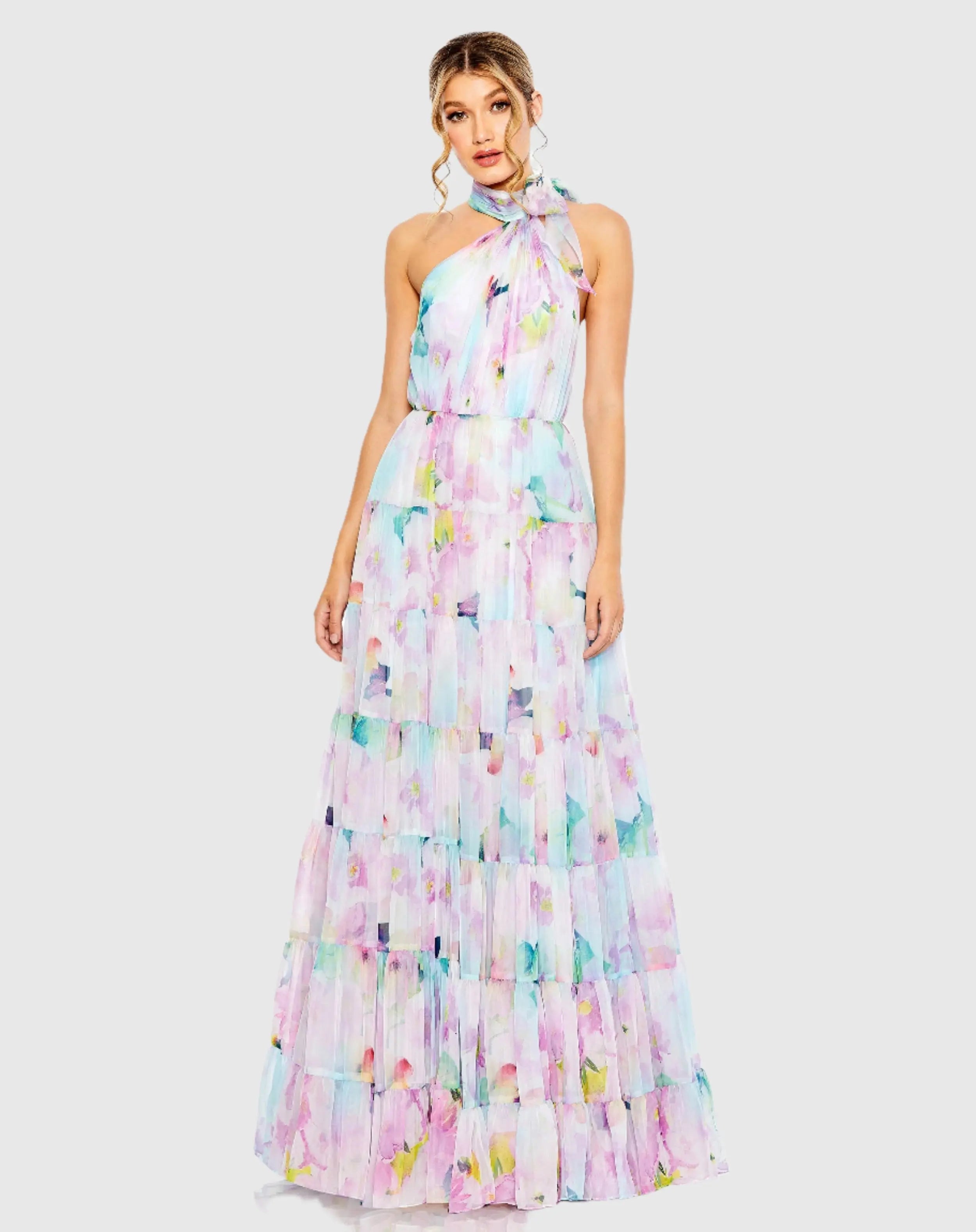 This gown is a stunning statement piece for your next event. Adorned with a vibrant floral print, this gown boasts a unique asymmetrical halter neckline that adds a touch of modernity. The tiered design adds depth and movement, creating an elegant silhouette that's perfect for formal occasions.