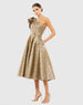 Stunning metallic tea-length dress with dramatic bow one-shoulder detail and functional pockets.