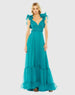 The Mac Duggal Iconic Ruffle Gown. Floor length tiered gown with daring side cutouts, a lace-up back, and dramatic ruffles at the shoulder. This best-selling silhouette is flattering on most body types and easily adjustable for the best fit.