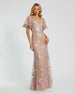 This stunning lace gown features a feminine neckline, short butterfly sleeves, and subtle floral sequin embellishments, making it a perfect, timeless choice for any formal occasion.