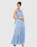 High neck halter gown features a pleated bodice, belted waist, and a tiered floor-length skirt.