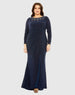 Our Long Sleeve Embellished Neckline Jersey Gown features a stunning crystal adorned neck detail and a flattering twist waist design. Made with comfortable jersey fabric and elegant long sleeves, this gown is perfect for any formal occasion.