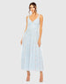 This floral embroidered a-line midi dress features intricate embroidery and playful ruffles, creating an elegant look perfect for garden parties or afternoon soirees.