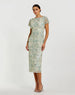 This soft sage cocktail dress shimmers with all-over pearl, rhinestone, and sequin beading. Its delicate sparkle and graceful silhouette create an effortlessly magical, ethereal look—perfect for weddings, parties, or evening events.