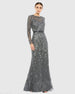Long sleeve evening gown with a high bead-accented neckline, fitted bodice, illusion yoke and sleeves, and a floor-length mermaid skirt with a sweeping hem. The mesh overlay is adorned with beads and sequins placed in an abstract pattern. A hand-beaded belt accents the natural waist.