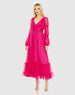 Crafted with a delicate chiffon overlay, this A-line dress boasts a flattering v-neckline and long puff tiered sleeves. The pleated cummerbund adds a touch of elegance while the ruffle tiered skirt creates a feminine silhouette. Perfect for any special occasion.