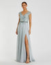 This flowy gown boasts an embellished cap sleeve bodice and flowing chiffon fabric. The thigh high slit adds a touch of elegance, making it a perfect choice for any special occasion. The embellished bodice adds a touch of glamour, guaranteeing you'll stand out from the crowd.
