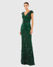 The Embellished V-Neck Cap Sleeve Sequin Gown features an all-over sequin design, a flattering V-neckline, short cap sleeves, and a detailed waist for a stunning silhouette. Beaded accents on the shoulders and skirt add an extra touch of sophistication, making this gown perfect for any special occasion.