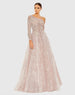 Inspired by constellations in the starry night sky, the embroidery on this dress is detailed with miniature twinkling rhinestones. The statement ballgown boasts an asymmetrical neckline with a single wrist-length sleeve, sheer bodice with enchanting leaf appliqué, and a full tulle skirt fit for any princess.