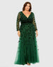 Stunning hand-embellished gown with v-neckline and long sheer sleeves.