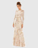 Elegant floral embroidered long sleeve lace trumpet gown with a beaded waist and a one-shoulder 3D floral accent.