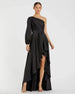 One-shoulder full-length satin dress with a single long sleeve, pleated bodice, and a pleated skirt with a hi-low hemline.