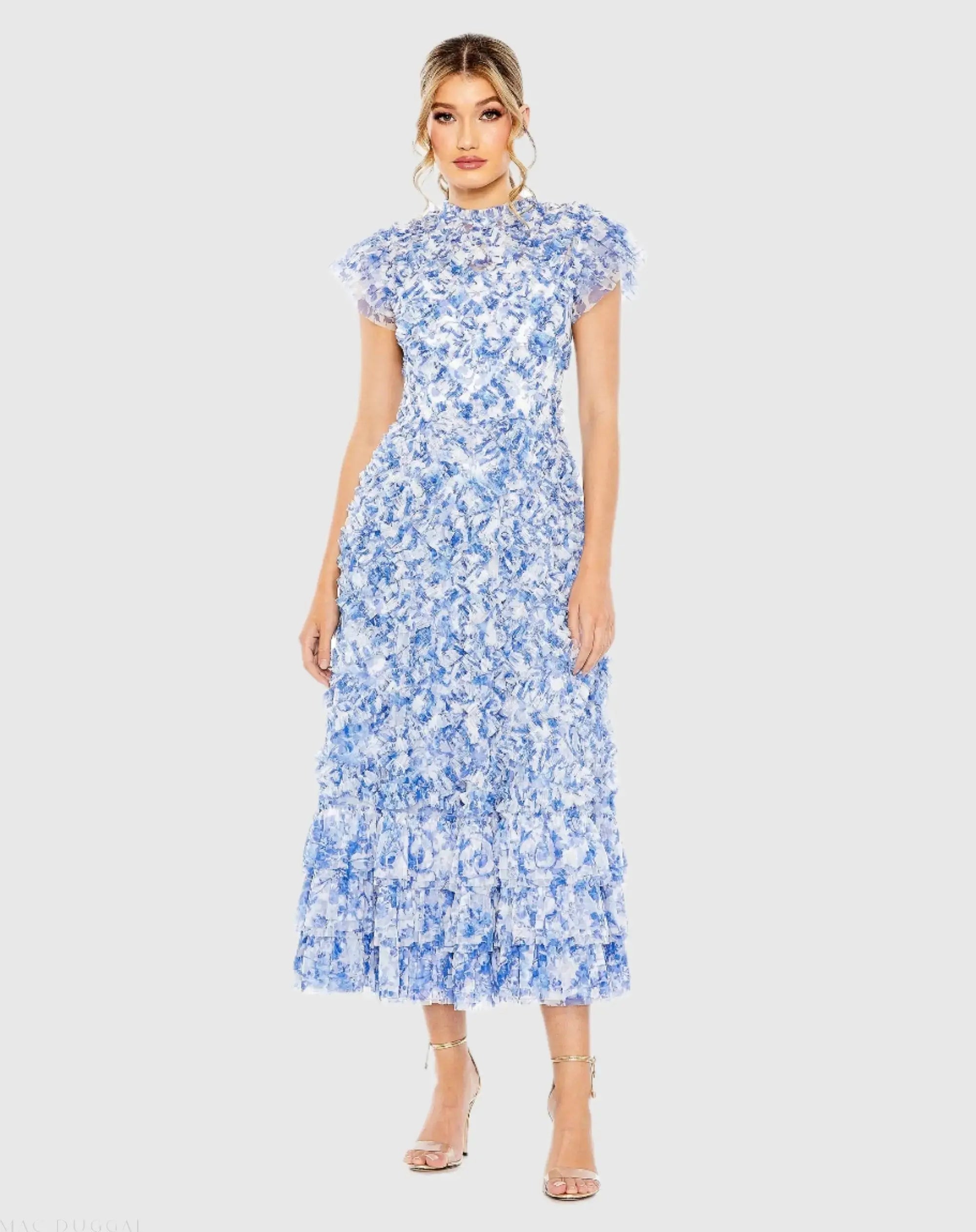 This enchanting dress features a floral-printed mesh overlay, adding a soft, romantic touch. The partially lined bodice and fully lined skirt ensure comfort, while the sheer unlined sleeves offer an airy, delicate feel. The illusion high neckline enhances the sophisticated design, and the short ruffled cap sleeves provide a playful, feminine touch. Allover ruffled frill detailing and an A-line silhouette complete the look, creating a flattering and elegant style perfect for weddings, garden parties, or any special occasion.