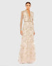 Long sleeve v-neck lace gown with decorative metallic-goldbeading applique and embroidered detail throughout. Natural waist is accent by a hand-beaded belt.