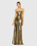 Crafted in shimmering metallic jersey fabric, this column gown boasts a sleek and modern silhouette. The fully lined design features a square neckline and sleeveless cut, while the lace-up open back adds a touch of drama. Perfect for making a statement at any formal event.