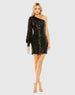 Elevate your style with our One Sleeve Sequin Mini Dress. Crafted from shimmering sequin fabric, it features a one-shoulder neckline and a single cuff sleeve for a bold, modern look. Perfect for any special occasion, this dress is sure to make you the center of attention.