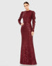 Expertly crafted from beautiful sequin fabric, this gown exudes elegance and sophistication. The long puff sleeves add a touch of drama to the column silhouette, making it the perfect choice for any formal occasion.