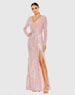 Long sleeved fully sequined evening gown accented with a ruched waist and thigh-high front slit.
