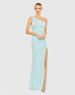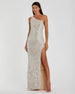 Crafted from luxurious sequin fabric, this stunning gown features a chic one shoulder neckline and a thigh high slit. The elegant draping at the back adds a touch of glamour, making it the perfect choice for any special occasion.